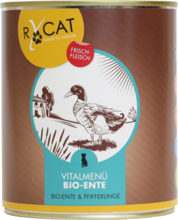 Mit dem Gericht Bio-Ente verwöhnen wir Ihre Katze! Ein maximales Fleischgericht mit Pfifferlingen, die dem zarten Entenfleisch ein wenig Würze geben und zusätzlich Vitalstoffe liefern.