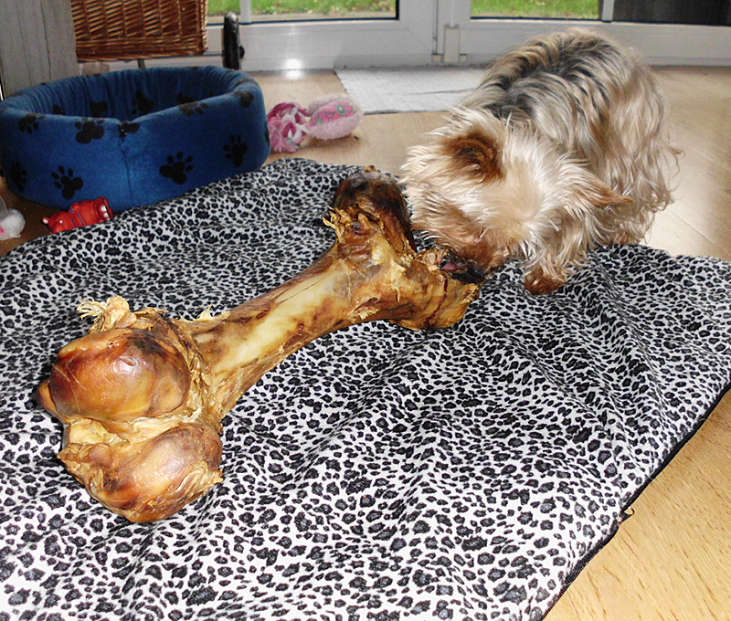 Der JUMBO Knochen von Anifit ist etwas Spezielles. Mit ca. 1,2 kg (9,99 Euro) bringt er große und kleine Hunde zum Verzücken. Hunde, die sich bisher gut vertragen haben, entwickeln bei dem JUMBO Knochen plötzlich einen Revierkampf und wollen partout nicht teilen. Den Knochen hergeben und für den nächsten Tag aufheben geht da schon gar nicht. Das beiliegende Bild zeit schön, dass sich auch kleine Hunde sich über den JUMBO Knochen freuen. Die Beschäftigung ist nicht nur für einen Tag sondern für viele Tage garantiert! :-)