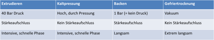Der Vergleich der Produktionsmethoden zeigt, dass die Variante der ofengebackenen Trocknung den Alternativen des Extrudierens und der Kaltpressung überlegen ist. Die Gefriertrocknung ist eine noch schonendere Variante, bietet aber keinen Stärkeaufschluss und ist deutlich kostenintensiver als das Backen.